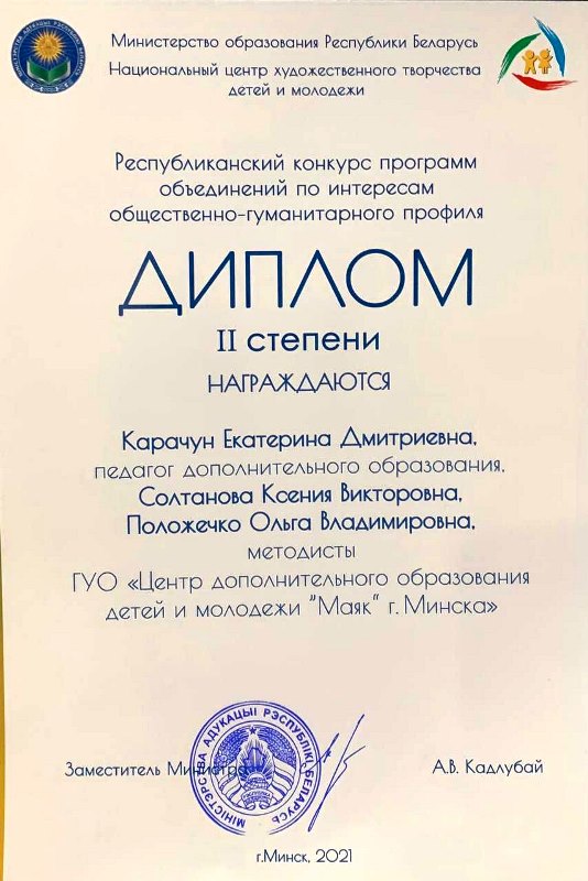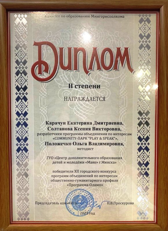 Коллектив авторов: руководитель кружка КАРАЧУН Екатерина Дмитриевна, методист СОЛТАНОВА Ксения Викторовна и заведующий УМК ПОЛОЖЕЧКО Ольга Владимировна - награжден дипломом 2-й степени республиканского конкурса программ объединений по интересам "Программа-Олимп" за разработку программы Community-парка "Play & speak".