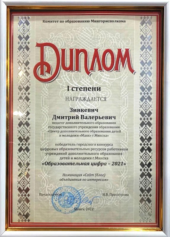17.03.2022В городском конкурсе "Образовательная цифра-2021" диплома 1-й степени удостоен ЗИНКЕВИЧ Дмитрий Валерьевич, педагог ЦДОДиМ "Маяк" г.Минска, за за распространение эффективного педагогического опыта через Инстаграм-страницу кружка "Swift".